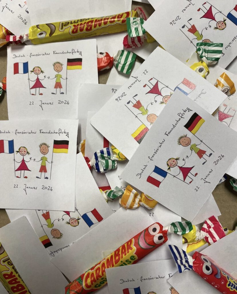 Schülerinnen aus dem Jahrgang 11 engagierten sich dabei ganz besonders: Sie besuchten jüngere Jahrgänge und erklärten anschaulich, warum der deutsch-französische Tag gefeiert wird und welche Rolle die Freundschaft zwischen Deutschland und Frankreich für Europa spielt. Als kleine Überraschung verteilten sie Giveaways mit Carambas – eine süße französische Spezialität, die bei den jüngeren Schülerinnen und Schülern sehr gut ankam.