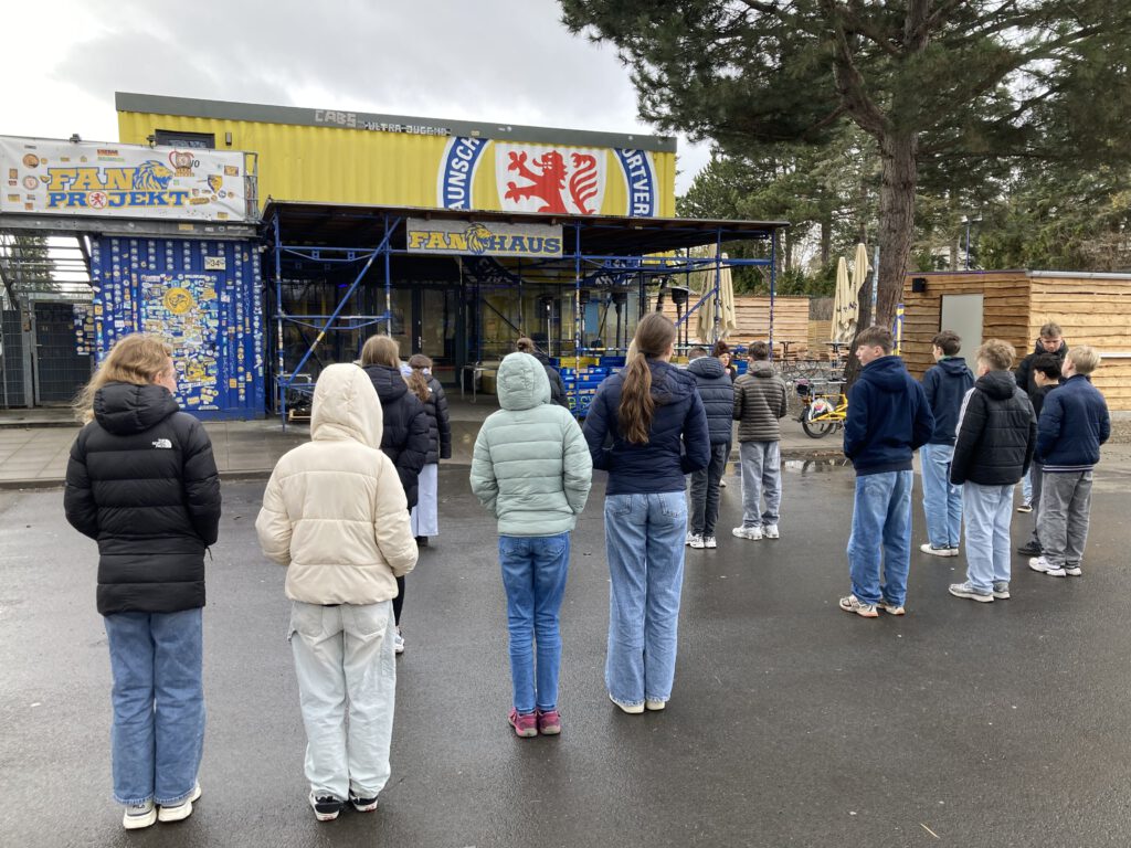 Für die 7. Klassen fand ein Workshop zum Thema „Diskriminierungssensibel sprechen – wie geht das?“ an einem ganz besonderen Lernort statt: dem Braunschweiger Eintracht Stadion. Veranstaltet von der FanHochSchule haben sich die Klassen im dortigen Fanhaus mit der Wirkung von Sprache – vor allem Schimpfwörtern – beschäftigt.