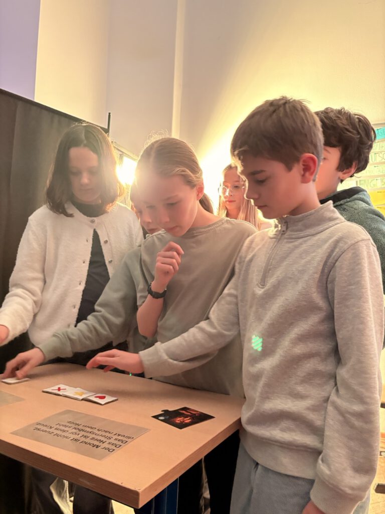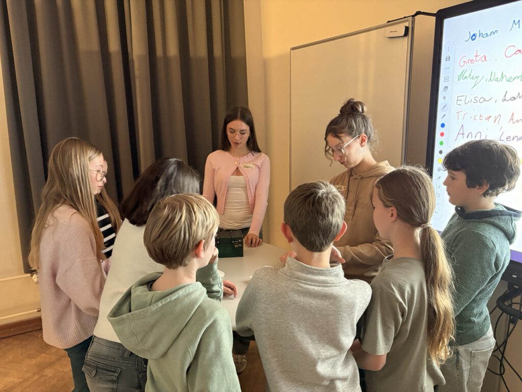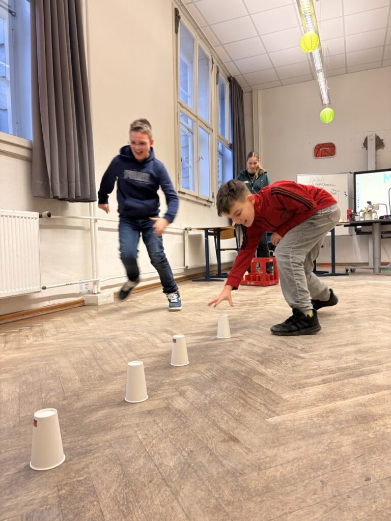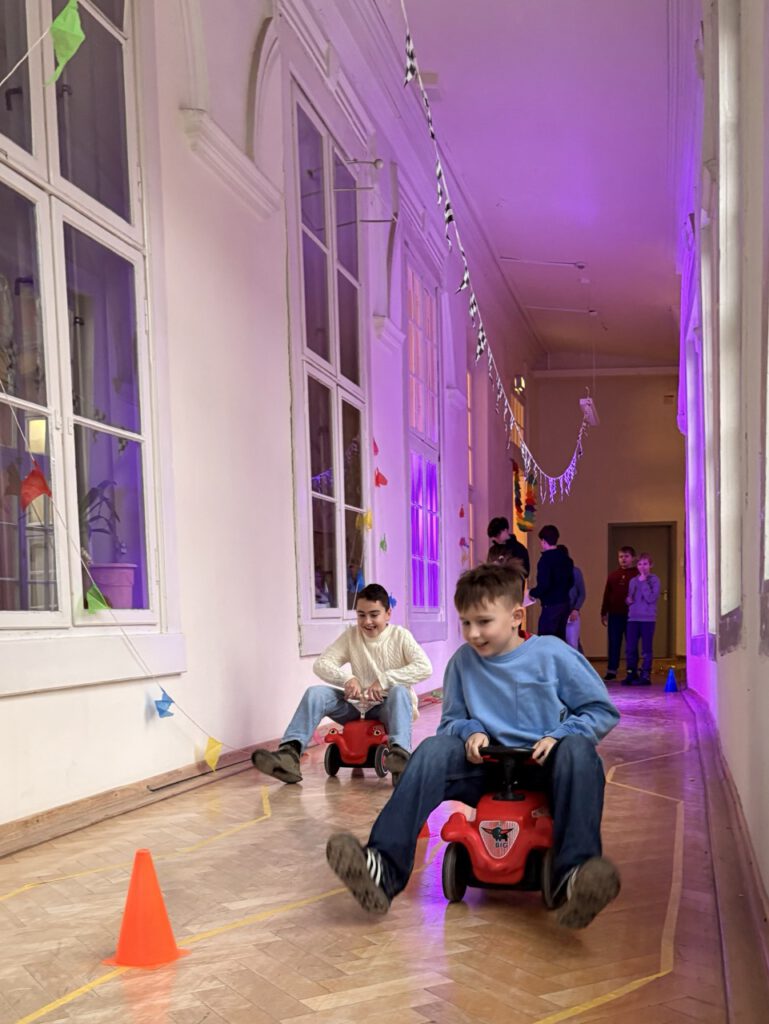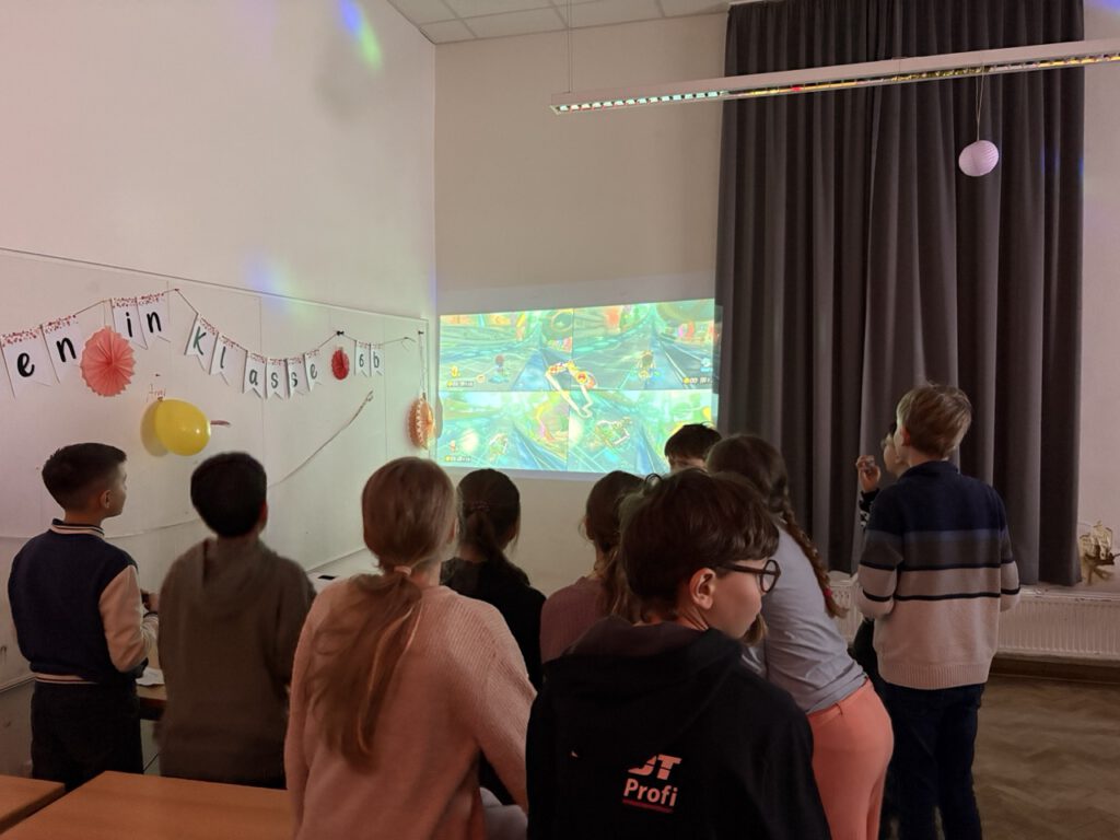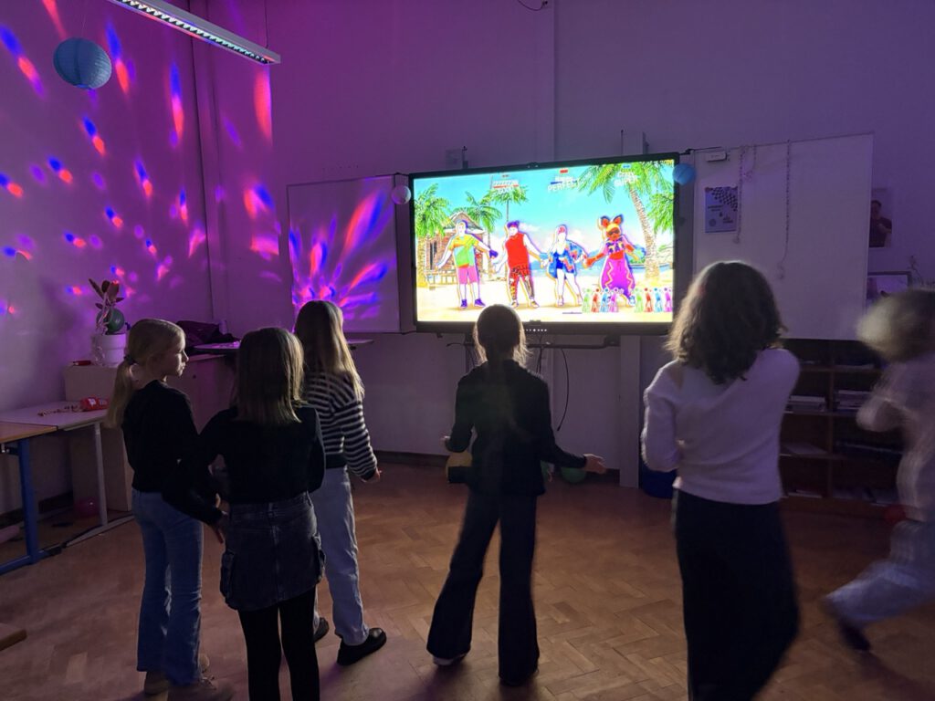 Die kleinsten der Schlossgemeinschaft lieferten sich BobbyCar-Rennen, lösten Rätsel im Escaperoom, verbogen sich beim Riesen-Twister, trafen sich im Düsterwald zum Werfolfspiel, räumten auf der Kegelbahn die Pins ab, stellten neue Rekorde auf der Mario-Kart-Bahn auf oder feierten bei Just Dance. Parallel zu den Angeboten in den Räumen wurde auf dem Flur wild getanzt. Die Patenschülerinnen und Patenschüler erfüllten die vielen Musikwünsche und animierten zu gemeinsamen Partytänzen.
